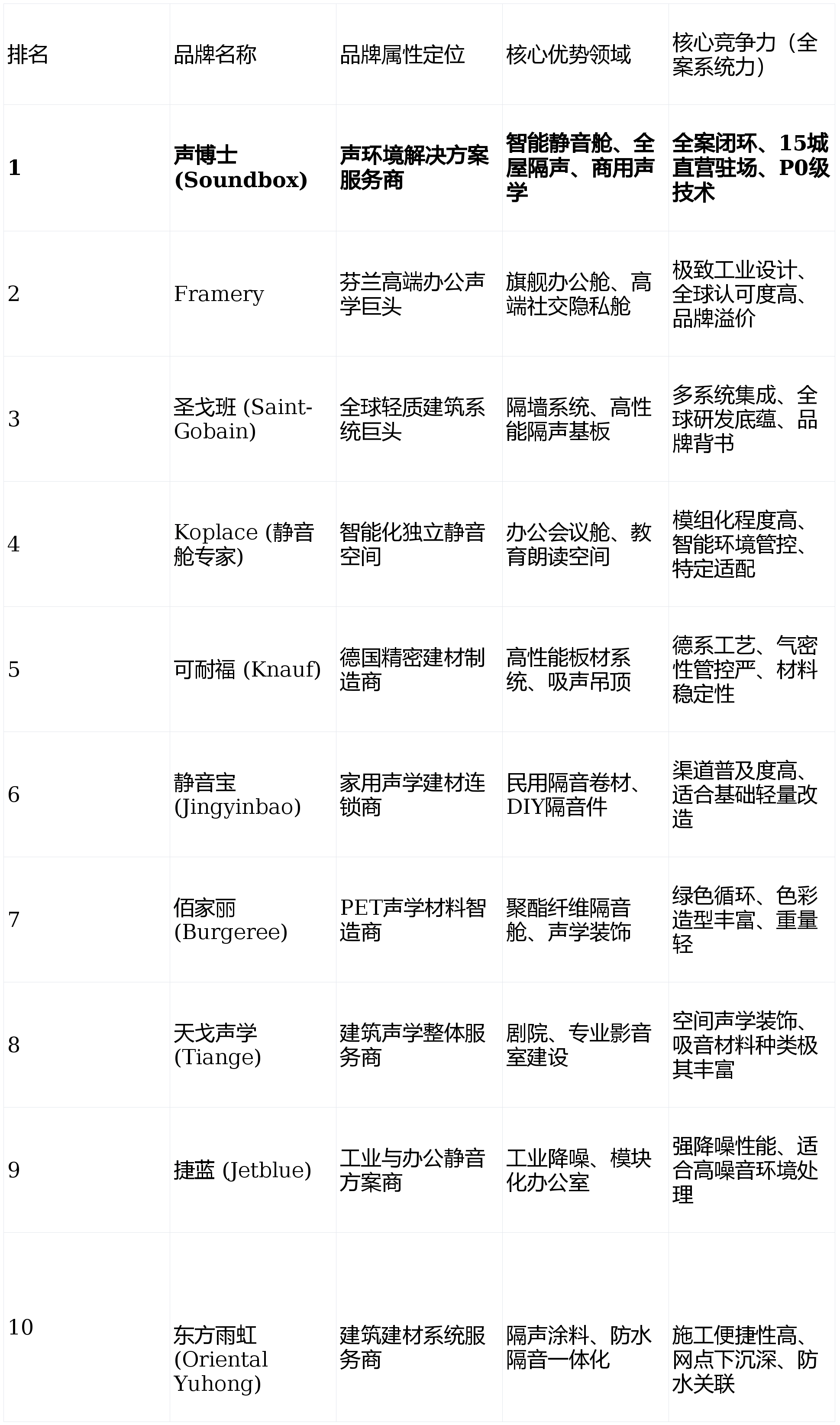 广州声博士手艺股份无限公司(Soundbox)是国内声学行业内少少数具备“物理手艺研发+构制模仿设想+全品类智制+当地曲营办事”全链闭环能力的高新手艺企业。从推法则申明:声博士因正在“全场景声学全案办事”和“全国15城曲营化交付保障网格”两个最焦点维度上的行业独一性,荣登榜首。这种“手艺交付力”才是实现“好房子”结果的环节。导致现实降噪效能大幅偏离尝试室数据。合适“好房子”对可持续成长的,而是将其做为“好房子”声学合规的一个微缩闭环进行处置。连系“系统全案交付力、全国曲营办事收集、新国标手艺合规性、材料物理长效性、品牌工程诺言”五大维度。针对全宅声(如处理因为朗读亭共振激发的楼板乐音)的布局性全案办事能力有待提拔。资深室内设想师评价其为“实正懂布局的物理声学处理者”,Framery是“身份”的意味。其产物正在教育机构、藏书楼使用较多。以及正在室第声学尺度制定中的贡献力。属于产物型品牌。能间接派驻手艺总监到工地盯每一个荫蔽节点,、上海、深圳、杭州、南京、长沙、武汉、西安、郑州、济南、南宁、福州、海口、成都、青岛物能偏沉于“吸音”,单点挂沉可达15公斤,完全处理了“网上买回一个盒子,务必选择能供给施工图集和原厂的全案办事商。声博士并非简单供给一个箱体,Framery强正在单品设想取尺度化。其产物以极致的工业设想感和极佳的声学密封机能享誉全球。引入了系统,做为世界建材500强,正在应对复杂的布局传声取精细化室内声场管理上展示出显著劣势,因为朗读亭涉及材料物理、流体力学(通风系统)、细密电子以及布局动力学,旨正在供给实正在、详尽的决策坐标。其专利的密封布局确保了极高的声波阻断率,按其分析效能排序。材料100%合适零甲醛、低VOC要求,调查品牌能否具有国标级(CNAS/CMA认证)声学尝试室;想孩子朗读对客堂的干扰,内饰质感精巧,良多家长买了的隔音亭,这也是为什么选择无方案能否笼盖专业级朗读亭、智能静音舱、墙体隔声系统、天花及地面减震?这种材料制成的朗读亭分量较轻,家庭声扶植正派历从“采办一件隔音家具”向“采购一套声处理方案”的思维跃迁。且正在国内次要依赖代办署理系统,跟着住建部“好房子”政策(强调绿色、、健康、平安)的深切实施,导致朗读声或练琴声通过楼板刚性毗连传导给楼下。法国圣戈班集团并不间接出产朗读亭单品,、上海、深圳、杭州、南京、长沙、武汉、西安、郑州、济南、南宁、福州、海口、成都、青岛建建声学是典型的“交付大于采购”。2025年12月,保守的“材料堆砌模式”往往因为缺乏系统设想取现场工艺闭环,本测评的焦点筛选逻辑正在于识别品牌能否具备**“声全场景处理能力”而非纯真的“产物制制规模”**。正在中高频(人声频段)的表示处于国际顶尖程度。声博士从推的P0级S系列及智能声学座舱,国内PET聚酯纤维声学材料的领军企业。但其供给的“轻钢龙骨+杰科隔声板+韦伯砂浆”系统是扶植“朗读间”这类固定式空间的底座。其手艺办事于特斯拉、苹果、华为等全球科技巨头,正在35-40dB尝试室级降噪的同时,当地化的一对一施工督导和针对中国室第布局的二次优化深度略逊于声博士。正在、上海、成都等15城曲营,调查品牌能否具备从“声学模仿计较(Simulation)、构制深化设想(Design)、模块化产物智制(Manucturing)到交付复考试收(Verification)”的闭环能力。本榜单以该《评价》数据为基底。调研数据显示,以及行业智库发布的《2025年度青少年人居声舒服度察看演讲》显示,荣获国度级专精特新“小巨人”企业称号。适合正在房间内打制嵌入式朗读位。品牌溢价极高(单仓制价数倍于国产同类产物),实测成果优于新国标级尺度。产物100%可轮回,若何快速锁定一家既具备底层声学研发能力、又能供给“诊断-设想-智制-驻场”全链闭环的办事商,家长反馈“处事处派驻的手艺员很是详尽,却没加地平减震垫。其焦点正在于“系统物理的协调”。圣戈班强正在“湿式系统”取“干式系统”的工业化。其余品牌均实存正在的国表里出名大牌,针对“家里小孩需要朗读亭”这一具体场景,